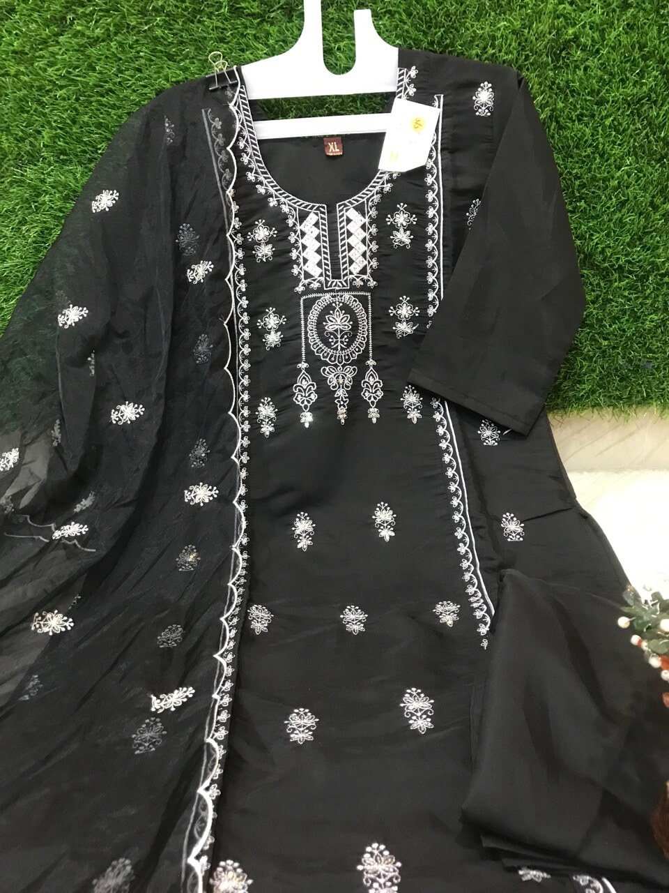 Black roman silk salwar with white embroidery on top and plain silk botton with organza dupatta