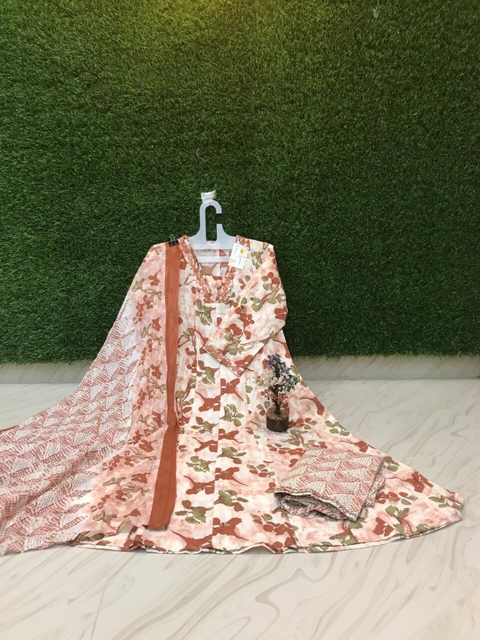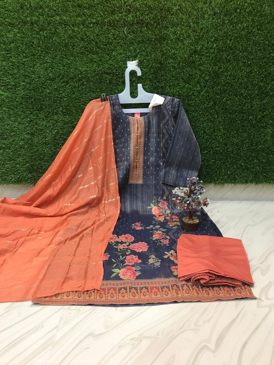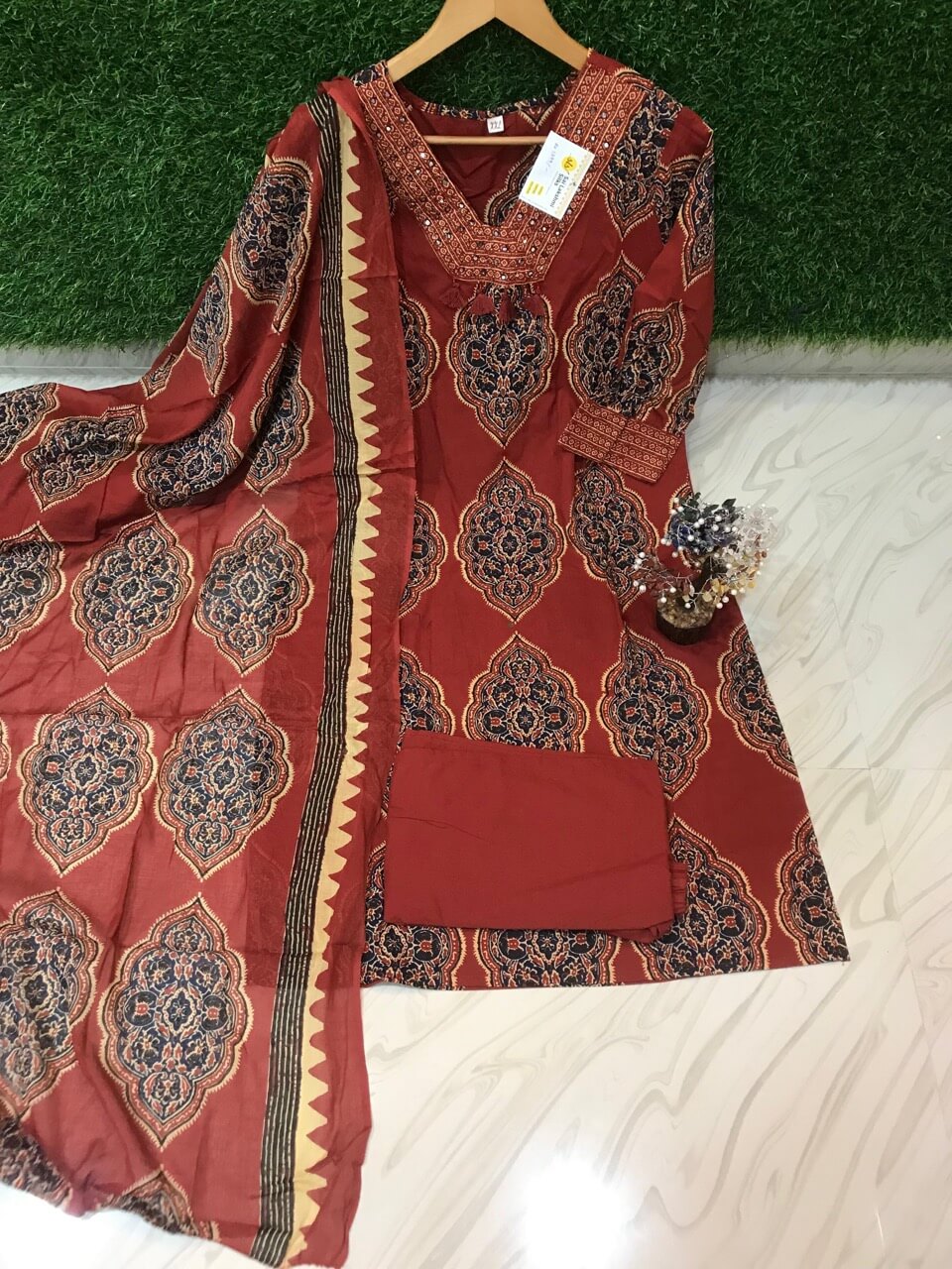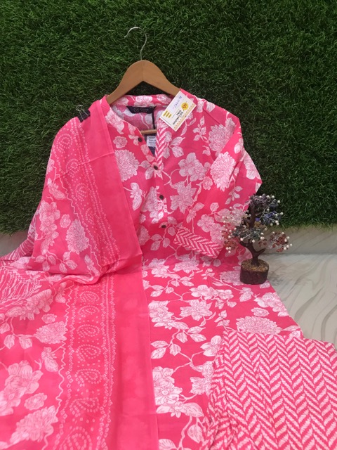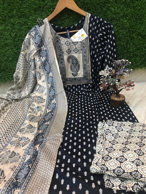 Silk cotton salwar with all over embroidery on the top and contrast multicolor dupatta and plain pants